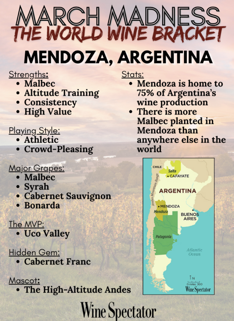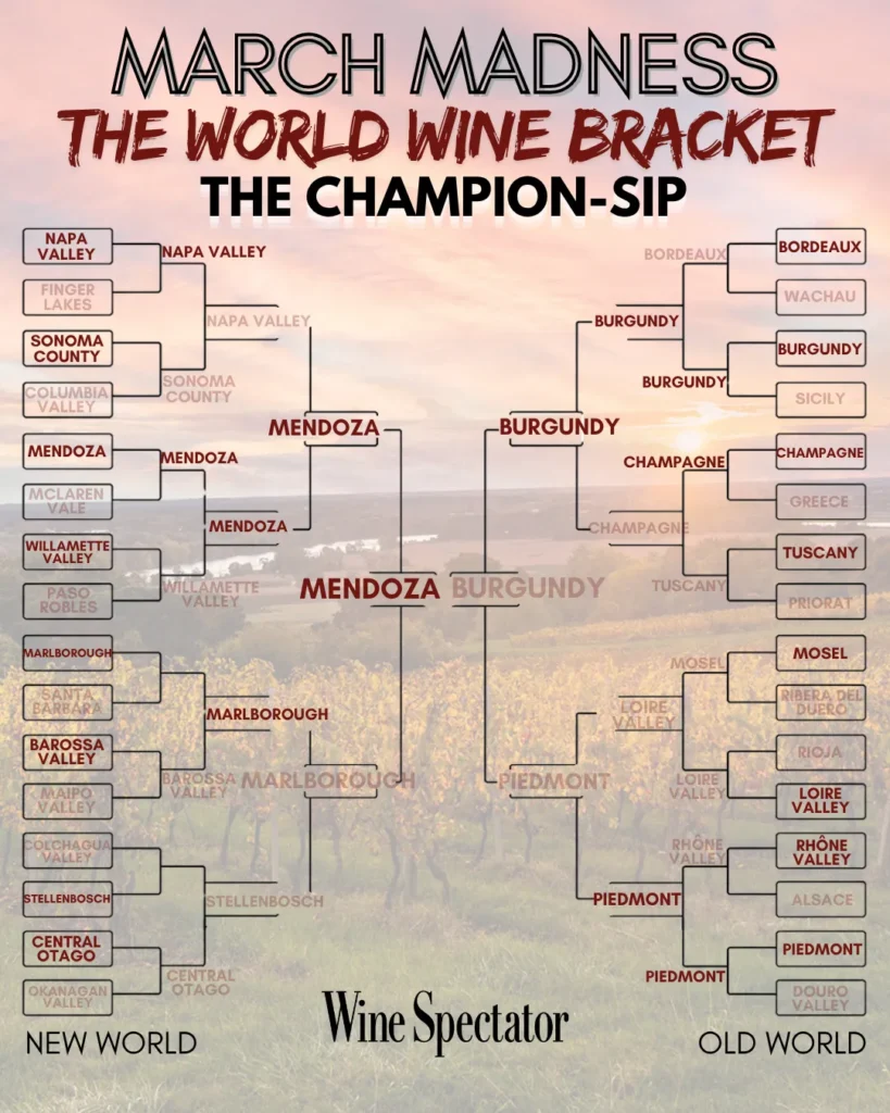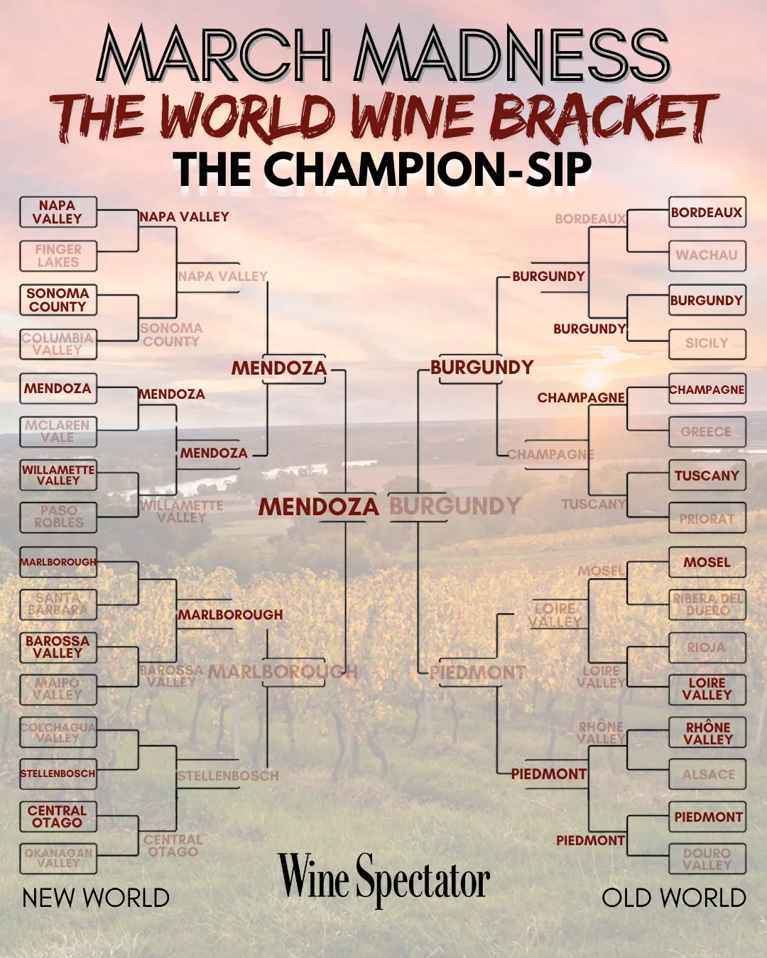 Mendoza se consagró ganadora del «World Wine Bracket», una competencia que organiza la prestigiosa revista Wine Spectator. Inspirado en el formato March Madness del básquet universitario de Estados Unidos, el torneo funciona por eliminación directa: 32 de las regiones vitivinícolas más importantes del planeta se enfrentan cara a cara hasta que solo queda una.
